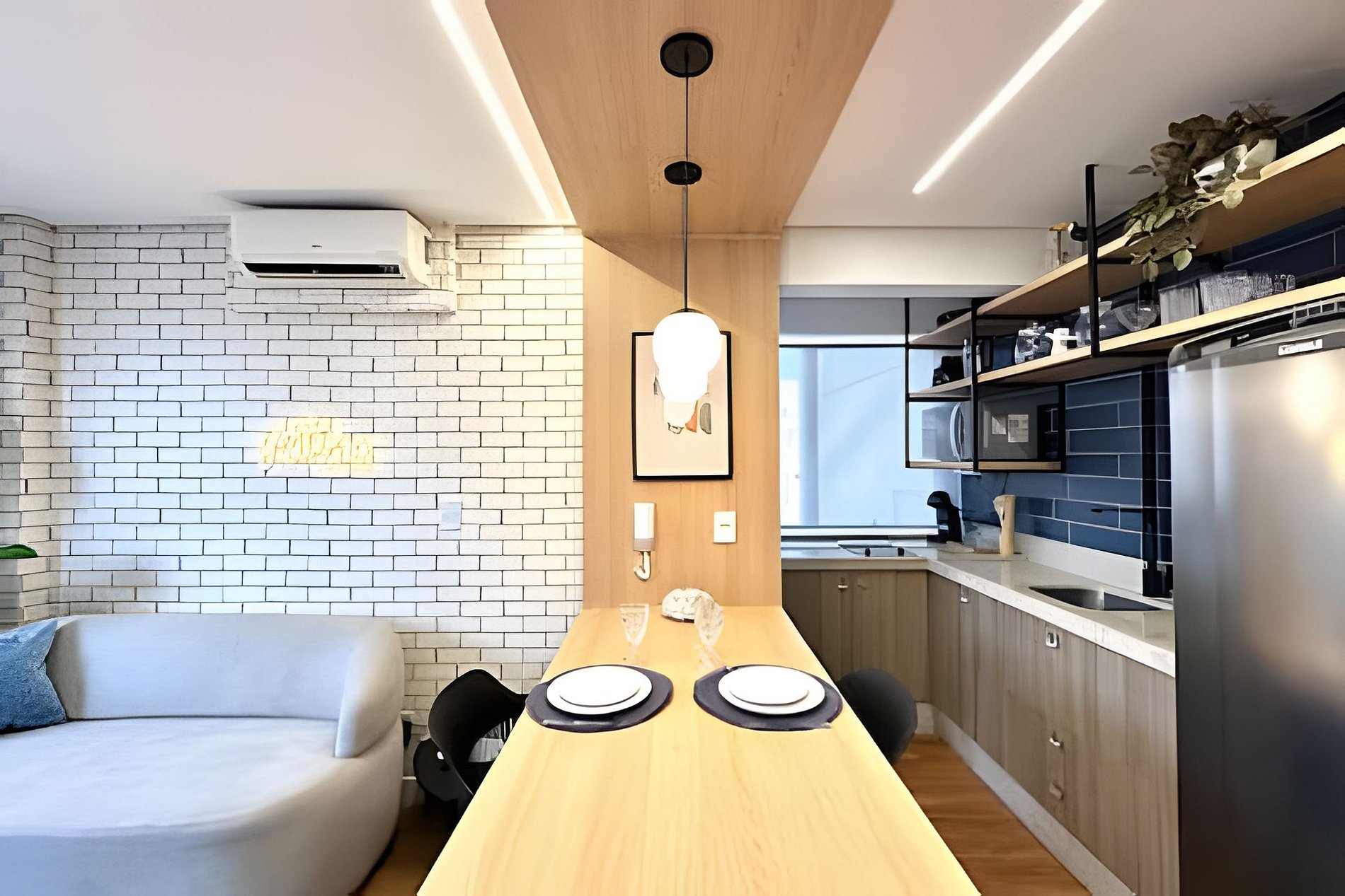 • Cozinha: Cozinha integrada, com eletrodomésticos essenciais (geladeira, micro-ondas, cooktop, cafeteira) e utensílios para preparo de refeições rápidas.