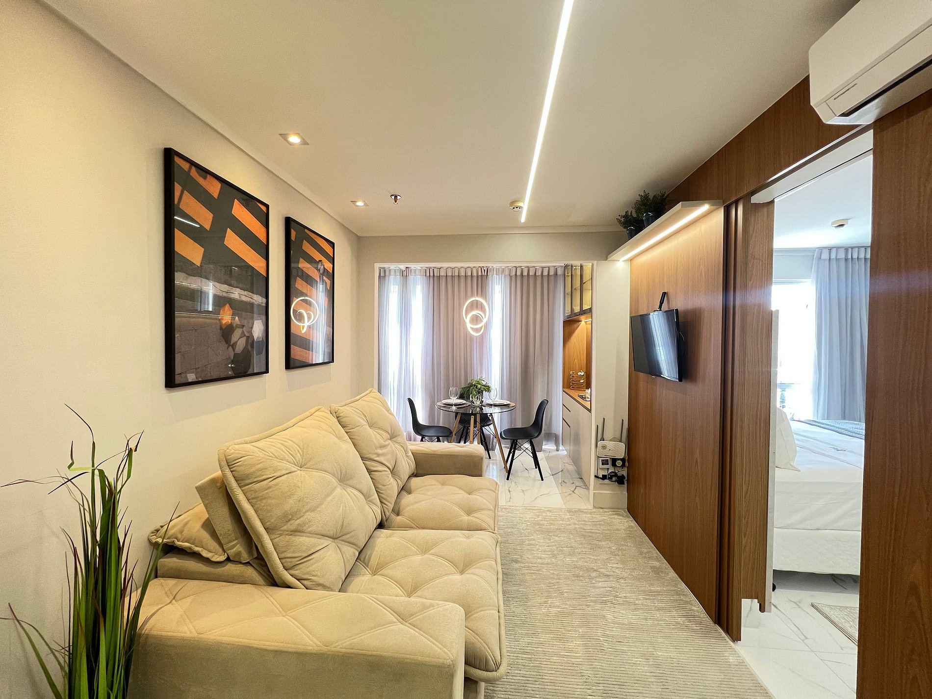 • Sala de Estar: Área de estar elegante com sofás confortáveis, TV de tela plana de alta definição e decoração moderna.