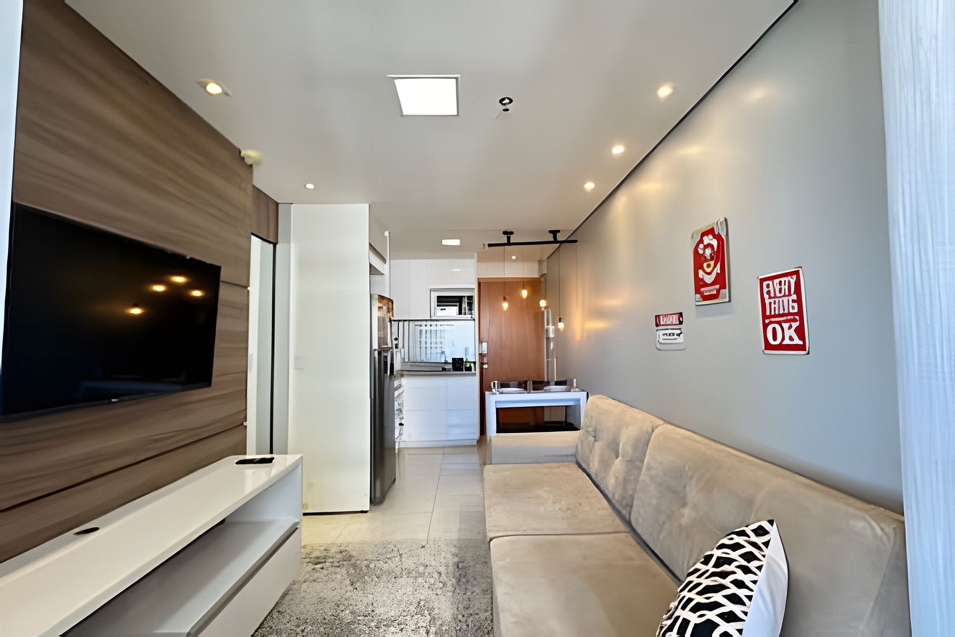 • Sala de Estar: Área de estar elegante com sofás confortáveis, TV de tela plana de alta definição e decoração moderna.