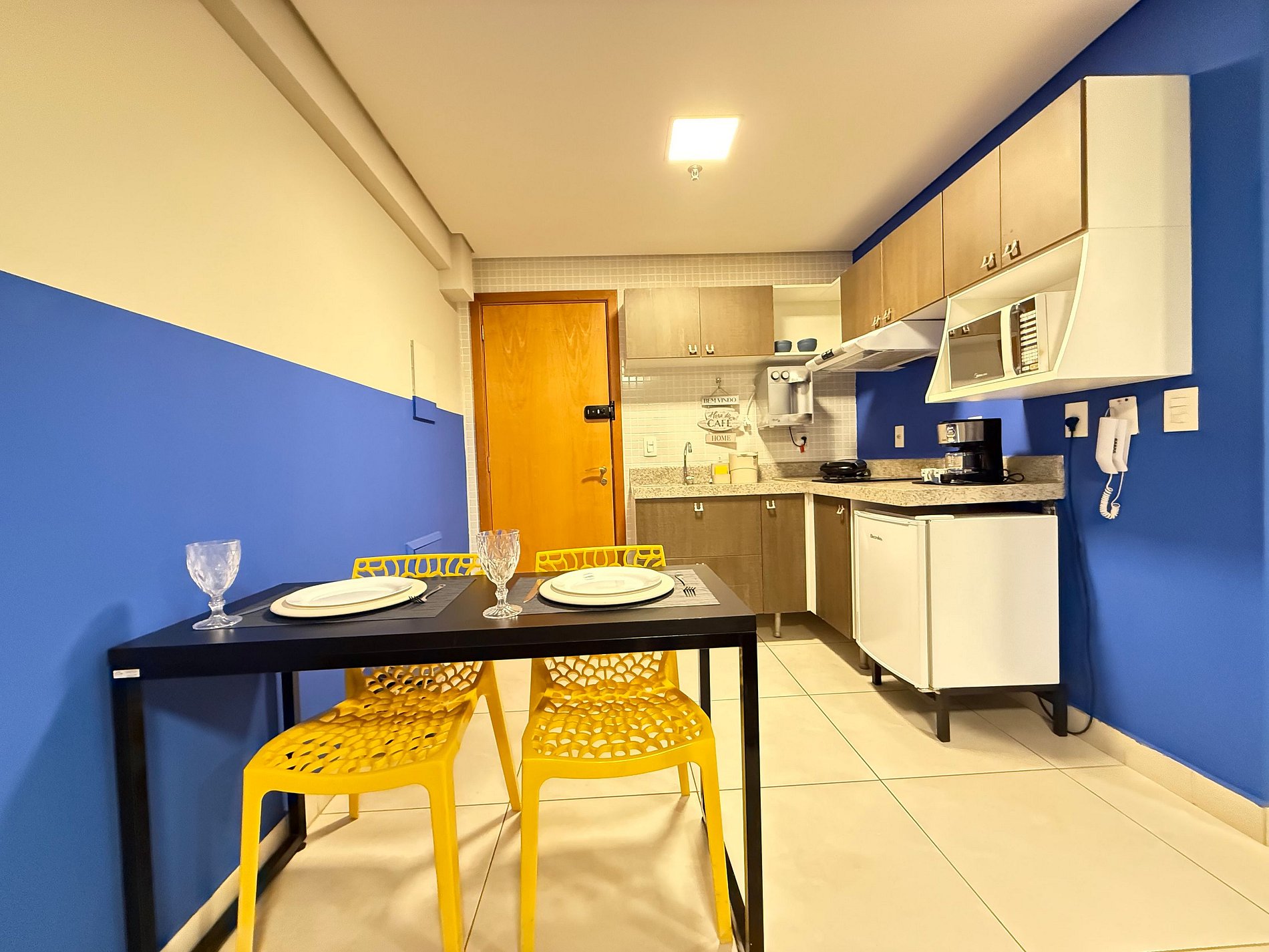 Espaço Aconchegante: Flat bem distribuído, com design funcional e decoração vibrante e cheio de boas energias, proporcionando um ambiente agradável. • Cama Confortável: Cama de casal com colchão de qualidade e roupa de cama limpa. • Cozinha Compacta: Cozinha equipada com fogão, frigobar, micro-ondas e utensílios básicos para preparar suas refeições. • Conectividade: Wi-Fi gratuito • Área de Trabalho: Mesa e cadeira para quem precisa de um espaço para trabalhar ou estudar. • Banheiro Completo: Banheiro com chuveiro quente e toalhas limpas.