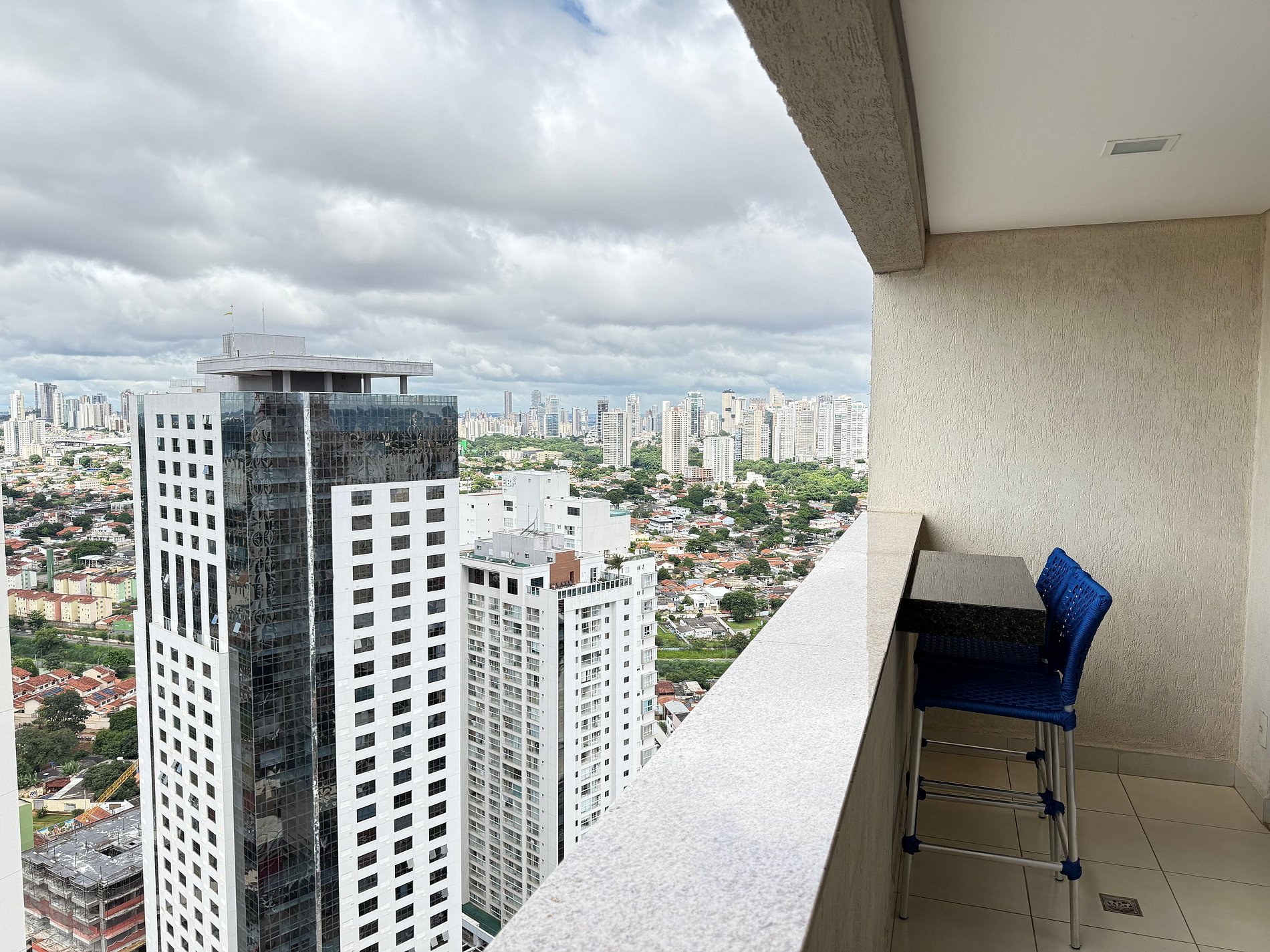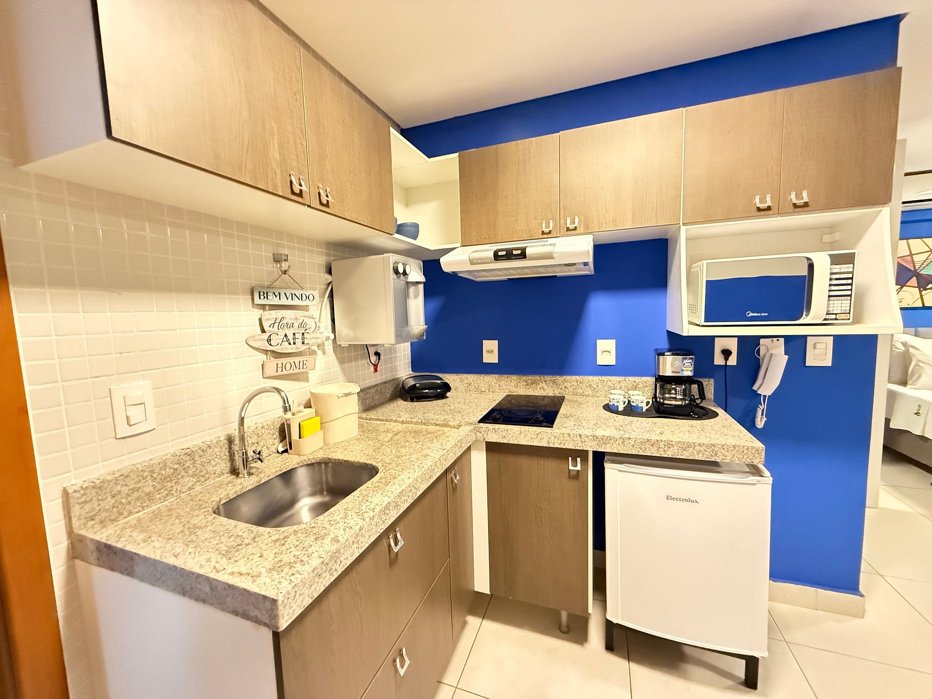 O flat fica no andar 21 , comporta duas pessoas, possui uma cama de casal ,guarda roupas, tv smart, varanda , micro-ondas ,wi-fi , fogão , bebedor ,chuveiro quente, cafeteira e frigobar.