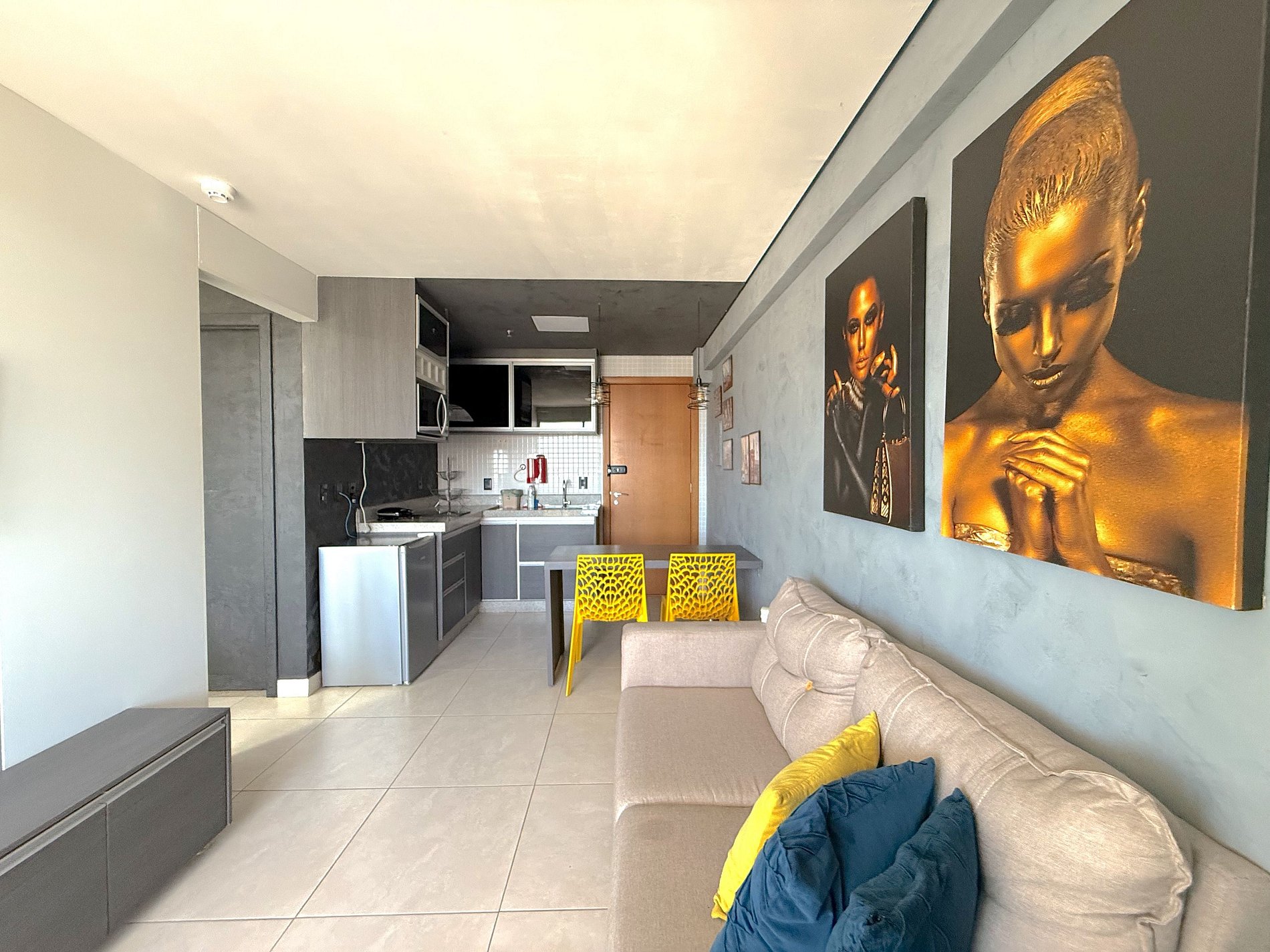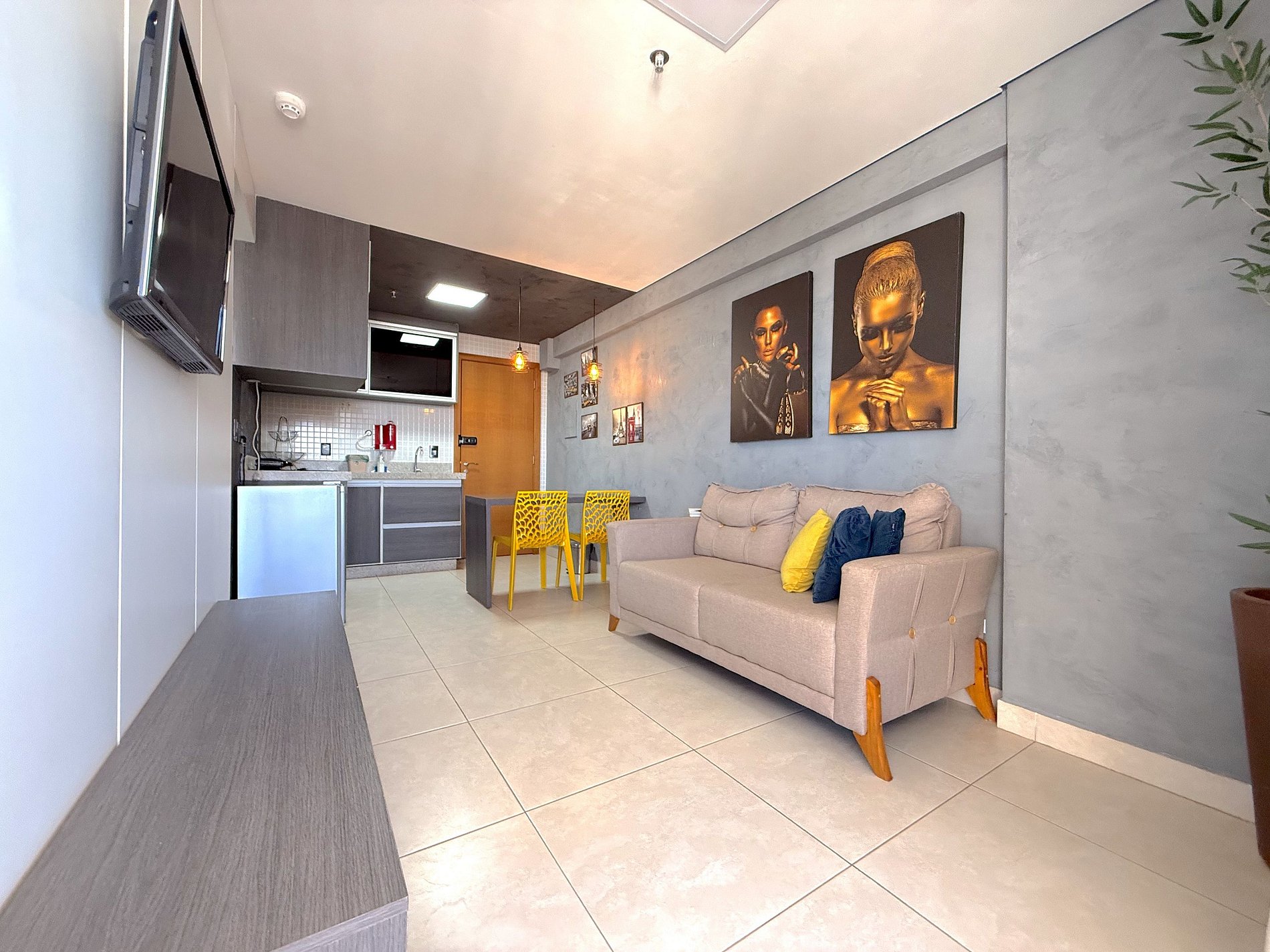 Apartamento Tipo Flat Studio, com Sacada, Cozinha compacta completa em eletrodomésticos, Fogão, Geladeira/Frigobar, Micro-ondas, cafeteira, sanduicheira, Liquidificador e Utensílios, o quarto e Sala de estar com TV, Sofá, cadeira, Cama, Guarda Roupas e cortinas.