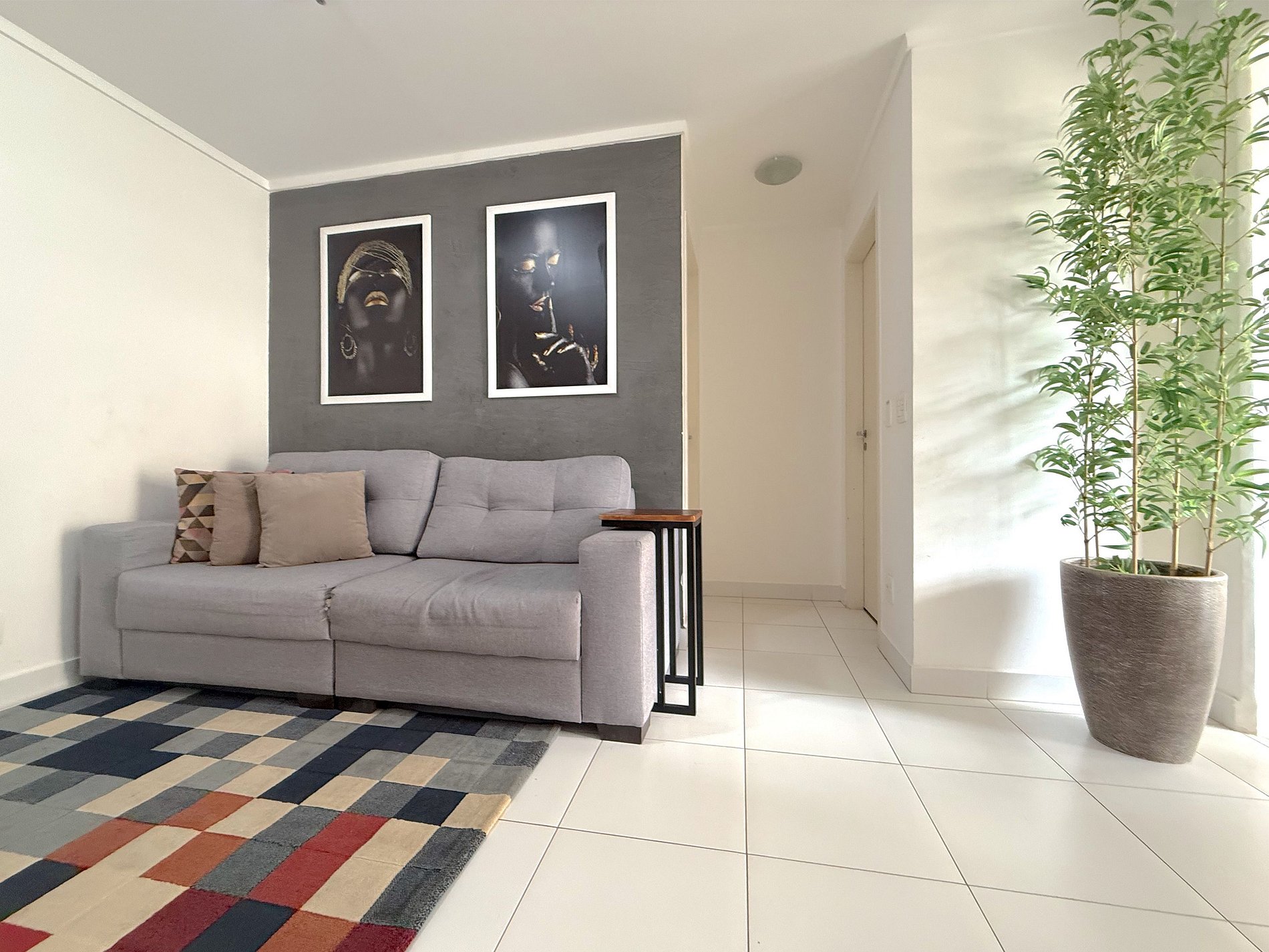 Apartamento Tipo Flat Studio, com Sacada, Cozinha compacta completa em eletrodomésticos, Fogão, Geladeira/Frigobar, Micro-ondas, cafeteira, sanduicheira, Liquidificador e Utensílios, o quarto e Sala de estar com TV, Sofá, cadeira, Cama, Guarda Roupas e cortinas.