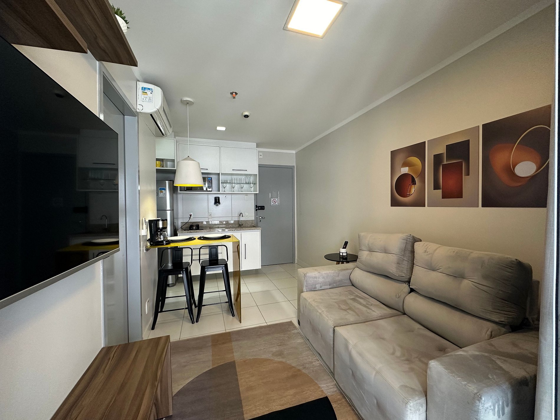 • Sala de Estar: Área de estar elegante com sofás confortáveis, TV de tela plana de alta definição e decoração moderna.