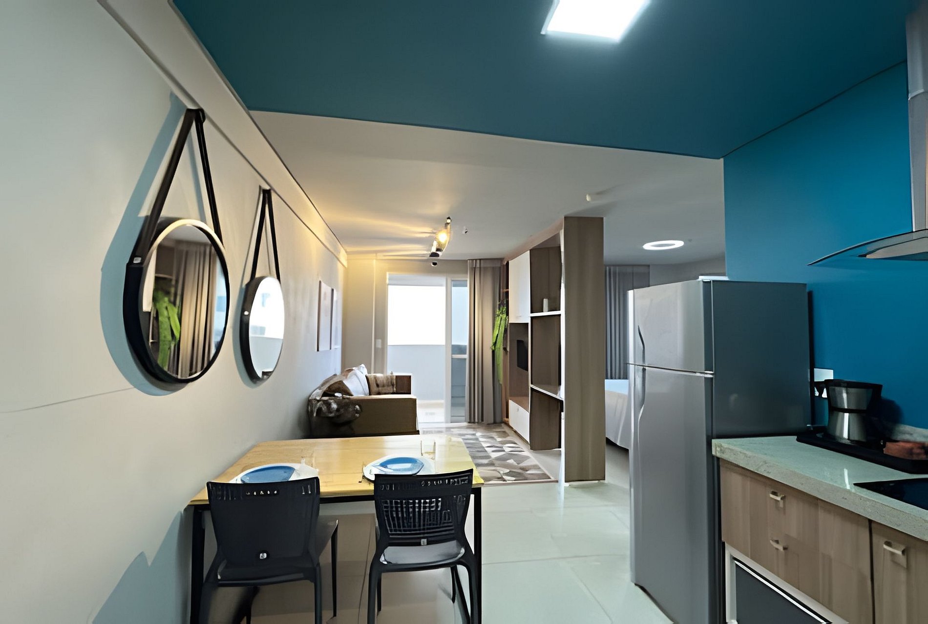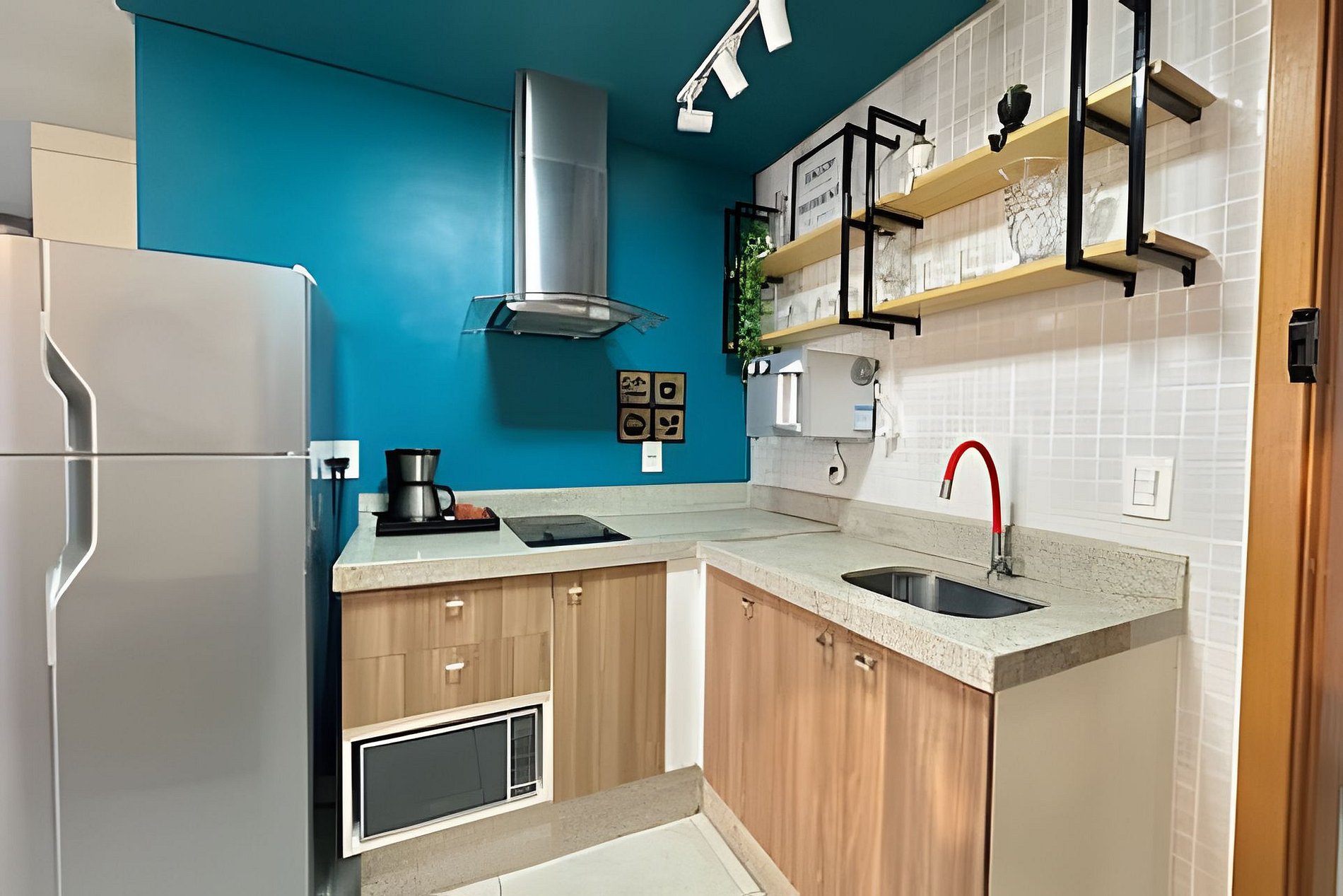 • Cozinha: Cozinha integrada, com eletrodomésticos essenciais (geladeira, micro-ondas, cooktop, cafeteira) e utensílios para preparo de refeições rápidas.