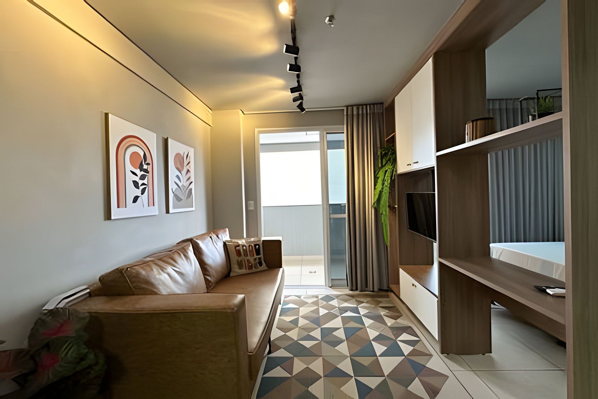 Apartamento Tipo Flat Studio, com Sacada novo bem dedorado com um uma mesa na sacada para vocês fazer as refeições com uma bela vista Cozinha compacta completa em eletrodomésticos, Fogão, Geladeira/Frigobar, Micro-ondas, cafeteira, sanduicheira, Liquidificador e Utensílios, o quarto e Sala de estar com TV, Sofá, cadeira, Cama, Guarda Roupas e cortinas.