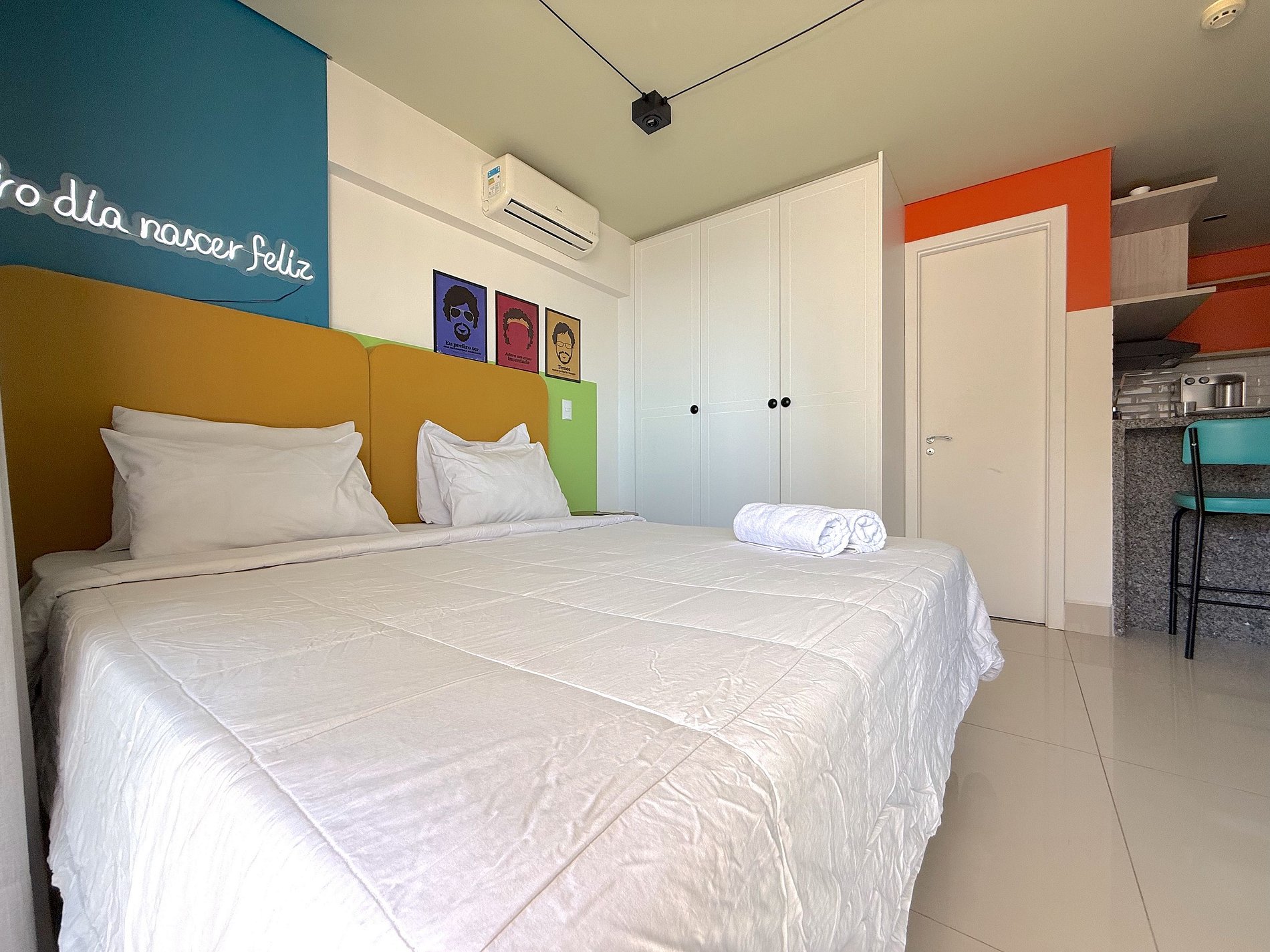 Espaço Aconchegante: Flat bem distribuído, com design funcional e decoração vibrante e cheio de boas energias, proporcionando um ambiente agradável. • Cama Confortável: Cama de casal com colchão de qualidade e roupa de cama limpa. • Cozinha Compacta: Cozinha equipada com fogão, frigobar, micro-ondas e utensílios básicos para preparar suas refeições. • Conectividade: Wi-Fi gratuito • Área de Trabalho: Mesa e cadeira para quem precisa de um espaço para trabalhar ou estudar. • Banheiro Completo: Banheiro com chuveiro quente e toalhas limpas.